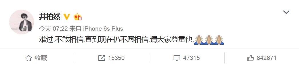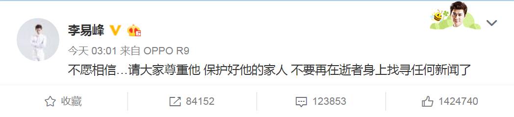 消息一爆出,微博上就炸了锅。曾经的“倾城四少”另三位付辛博、李易峰、井柏然都在第一时间发出微博,震惊、惋惜之余,更希望公众和媒体尊重逝者。
