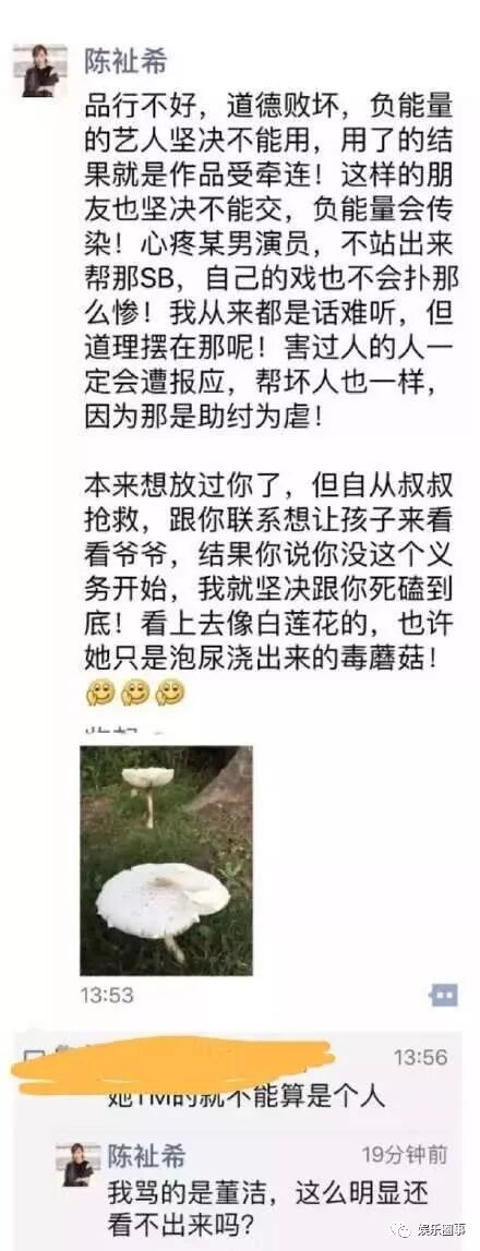 前几天,又有潘粤明的前经纪人陈祉希发朋友圈实名diss董洁,说她是毒蘑菇,措辞相当犀利,丝毫没有给董洁留面子。