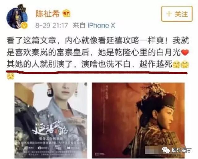 陈祉希也不止一次实名diss董洁,之前还发微博说自己就是想喜欢秦岚演的富察皇后,她才是白月光,某人就别演了,演啥也洗不白,越作越死,还配上了董洁的图。