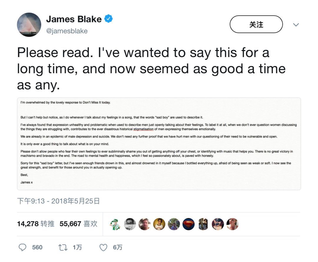 考虑到这一点,流行音乐中悲伤元素的崛起—在这项研究中被定义为音乐的“明亮度”的降低—是否只是因为人类,包括艺术家们,更贴近感情和身边的环境了?这个假设是合理的,因为历史上艺术家们也曾附和人们对开心歌曲的明显偏好。然而,制作人、歌手、作曲家 James Blake 的最近的推特显示,我们难以将某种音乐完全称为悲伤。确实 James Blake 的音乐听起来是忧郁的,但简单地将他想表达的归为“悲伤”,或将他定义为“悲伤男孩”,是否忽视了他想表达的丰富感情体验?毫无疑问是的,因为感情表达几乎从不是非快乐即悲伤的二选一。