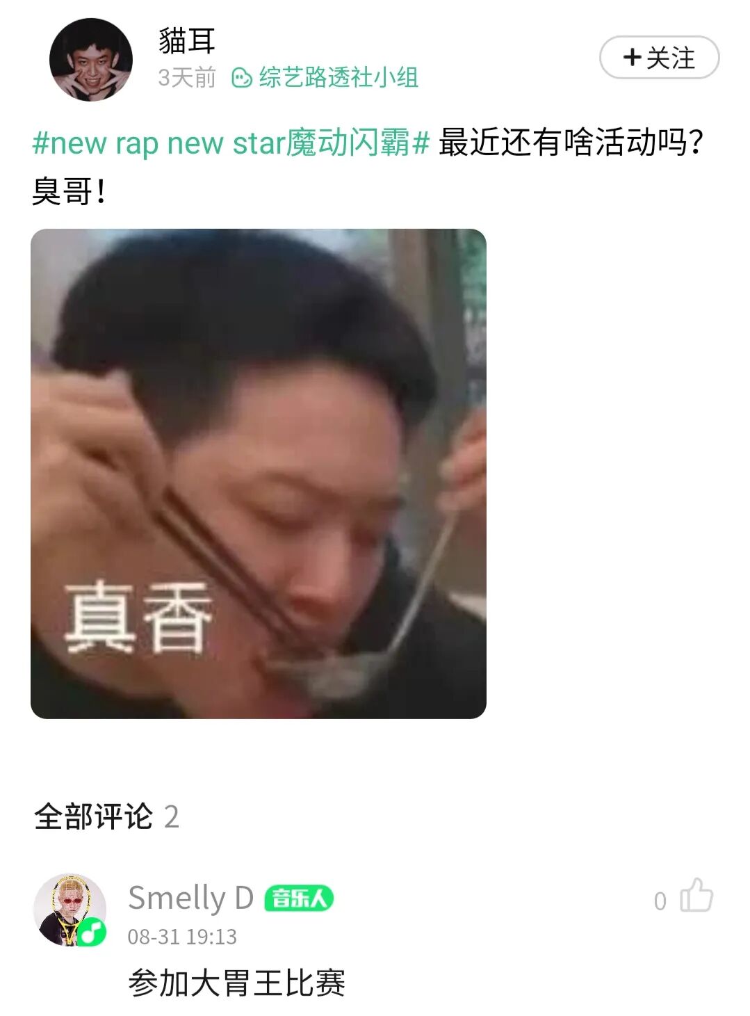 Smelly小哥哥跟粉丝们幽默互动,看到自己的真香表情包,立马接梗回应要去参加大胃王比赛。