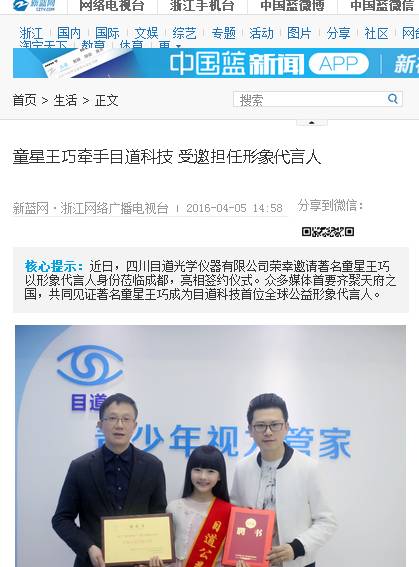 近日,四川目道光学仪器有限公司邀请到了著名童星王巧以形象代言人身份亮相签约仪式。众多媒体首要齐聚天府之国,共同见证著名童星王巧成为目道科技首位全球公益形象代言人。