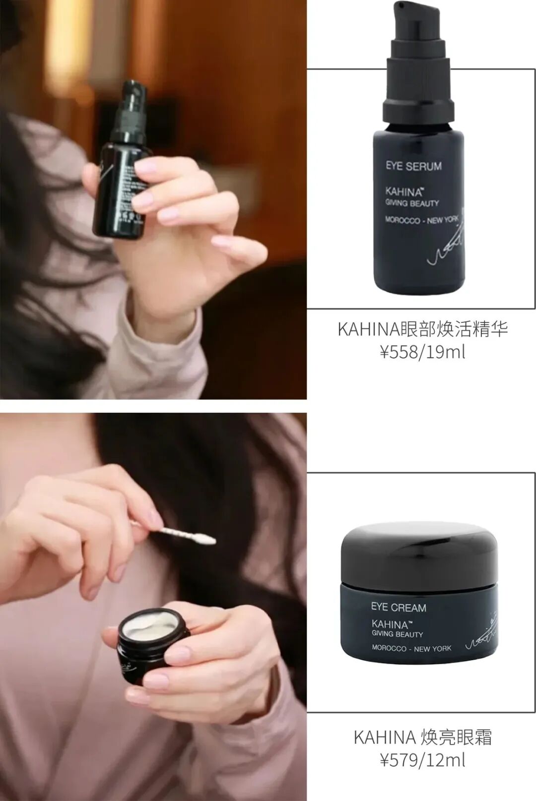 章小蕙最近超爱KAHINA的眼精华和眼霜,活性肽和抗皱植萃共同作用,就很强。如果是油皮或者年轻皮肤,只用精华就可以,要是皱纹比较明显,叠加眼霜一起使用效果会更好。