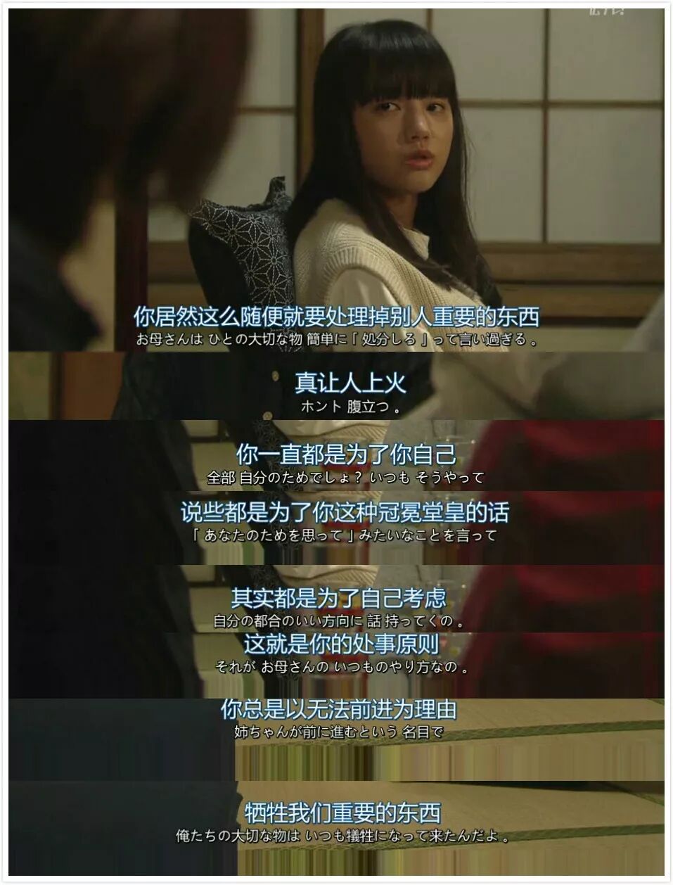 比如第一集中的一段,就很戳中部屋君,回到家中的姐姐想把弟弟的东西给收拾丢掉,她的女儿春海则对母亲说出了这样的话