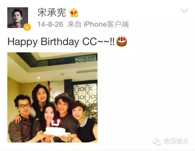 去年刘亦菲的生日是和剧组一块儿过的,宋承宪在微博上写:Happy Birthday CC!这个CC是谁,还用猜吗?