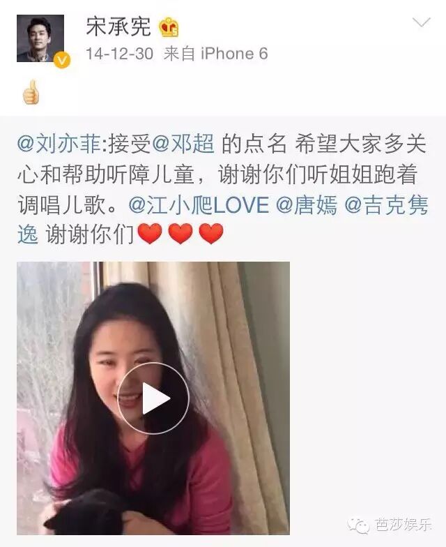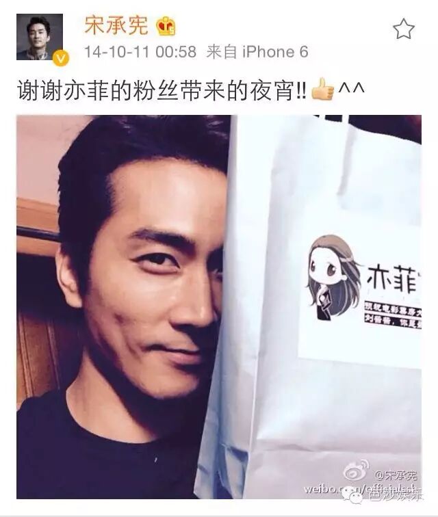 刘亦菲粉丝给的夜宵,宋承宪也有一份,请给芭姐解释一下这是啥意思!