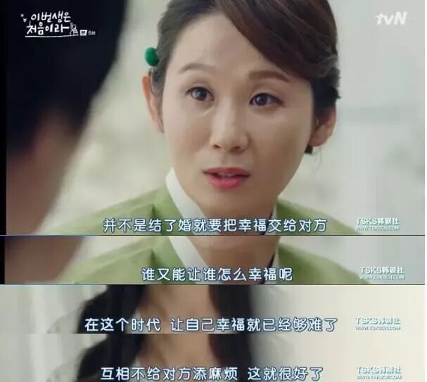 剧中女主的妈妈说过一句话,并不是结了婚,就要把幸福交给对方,谁又能让谁怎么幸福呢。在这个时代,让自己幸福就已经够难了。互相不给对方添麻烦,这就很好了。