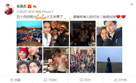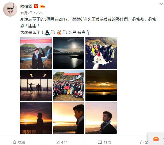 一向文艺的陈柏霖也在微博po出九宫格并写道,“永远忘不了的5个月在2017。谢谢所有火王幕前幕后的伙伴们。很感激,很感恩!谢谢!”