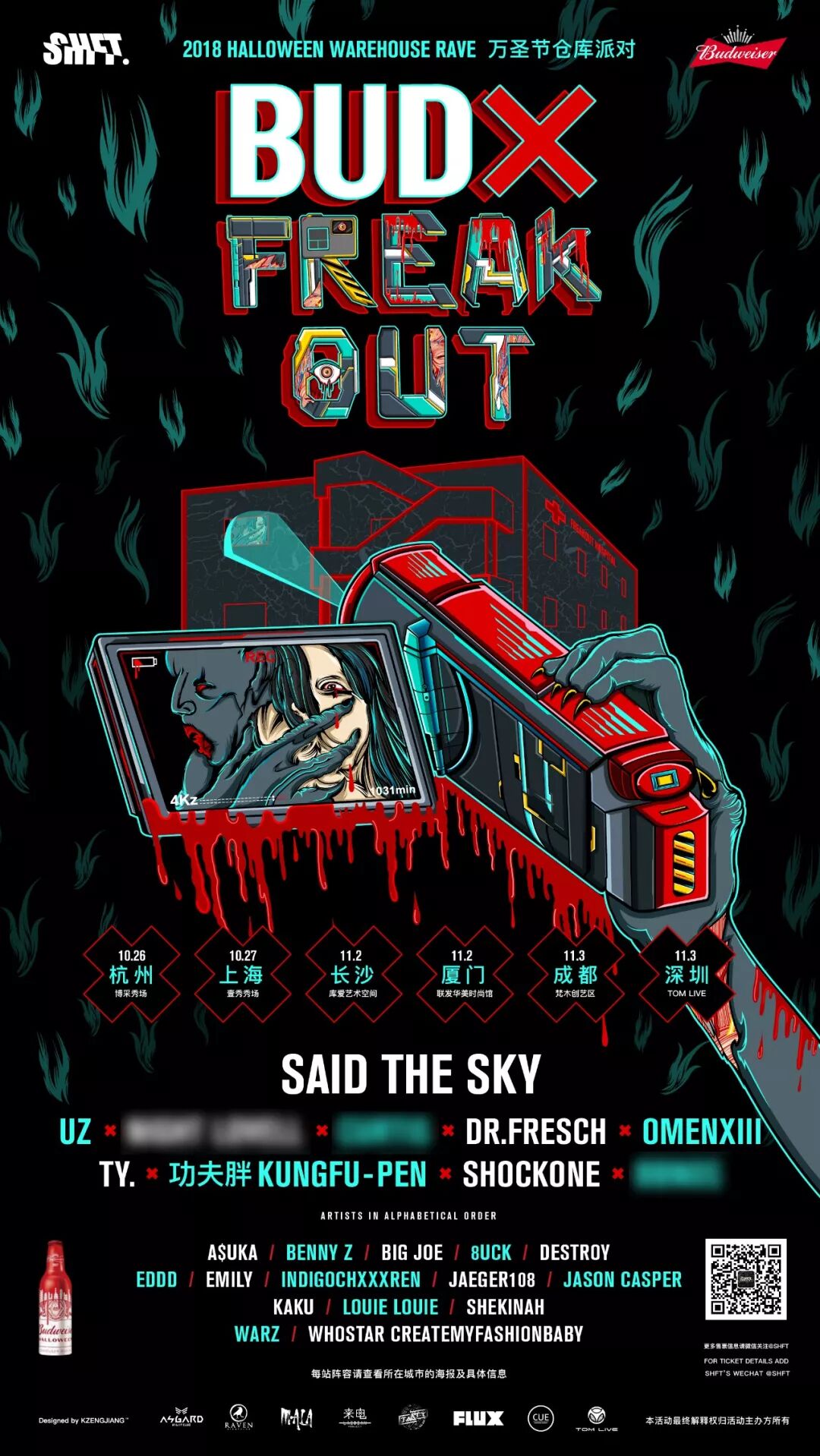 有没有准备好?乖乖接受被派对支配的恐惧?BUDX FREAK OUT,经过一年的漫长等待,这场最盛大、最疯狂、最火热的万圣节仓库狂欢终于要再次出现,席卷你们的视听,占据你们的大脑,上海、杭州、厦门、长沙、成都、深圳,中国六个城市即将被我们攻陷!今年要出现在FREAK OUT现场的艺术家阵容只能用疯狂形容,国内外的DJ和Rapper们,已经预订了你当晚的所有热情和尖叫!