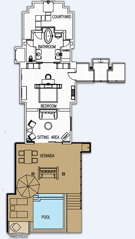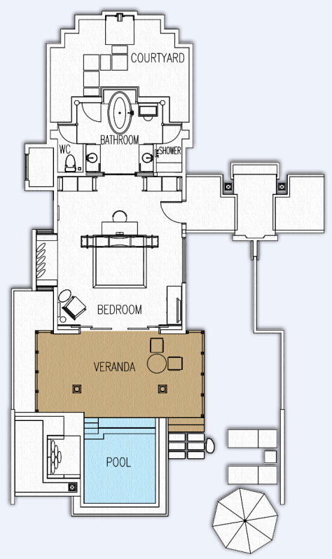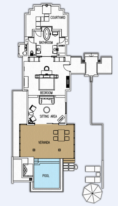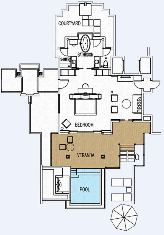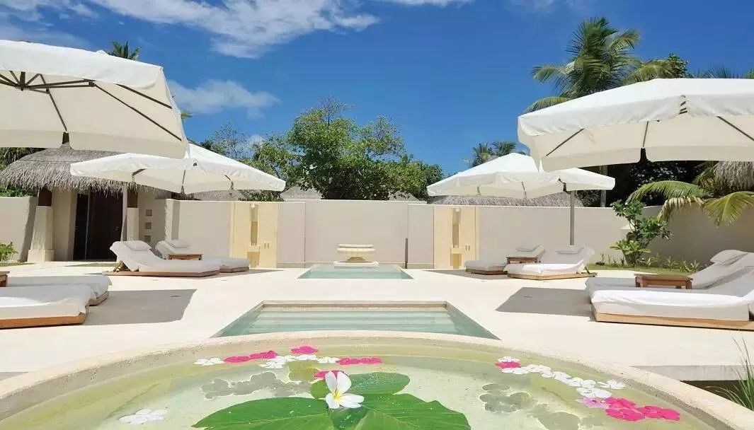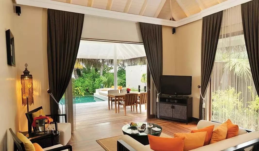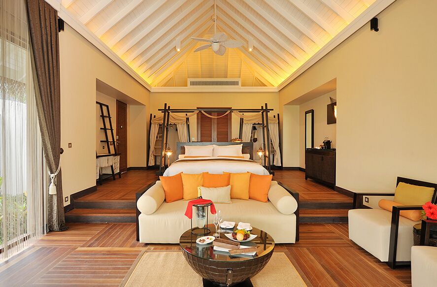 偌大的套房沿海滩而建,清澈的泻湖一览无遗。套房的起居空间宽敞,并是有私人大阳台和游泳池,以及适合享用浪漫私人晚餐的花园和直达海滩的通道。