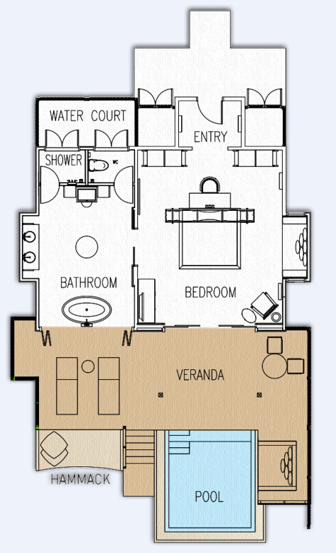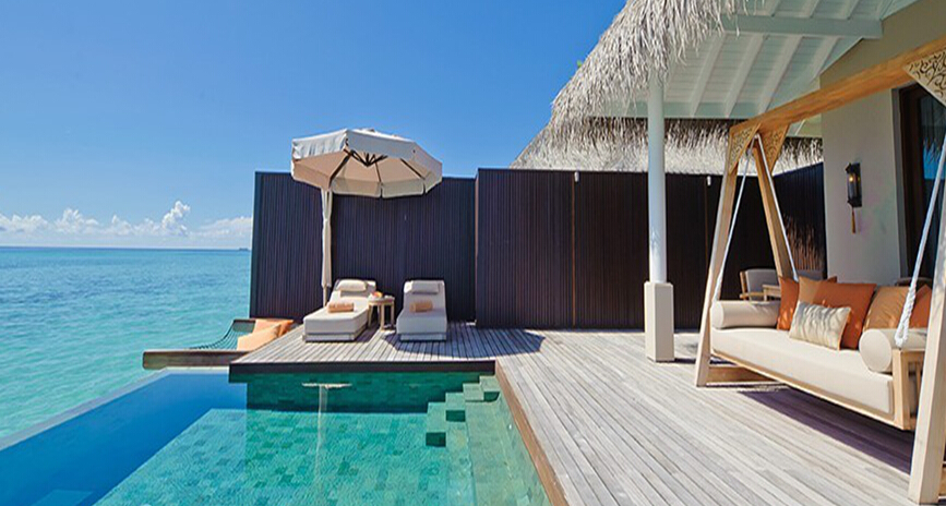 套房伫立在海滩之上,户外水上阳台附设特别入口,可以从海滩和海边进出套房。起居空间与卧室合二为一,空间更开扬宽敞,偌大的阳台设有马尔代夫摇椅和直达泻湖的通道,幽静写意。