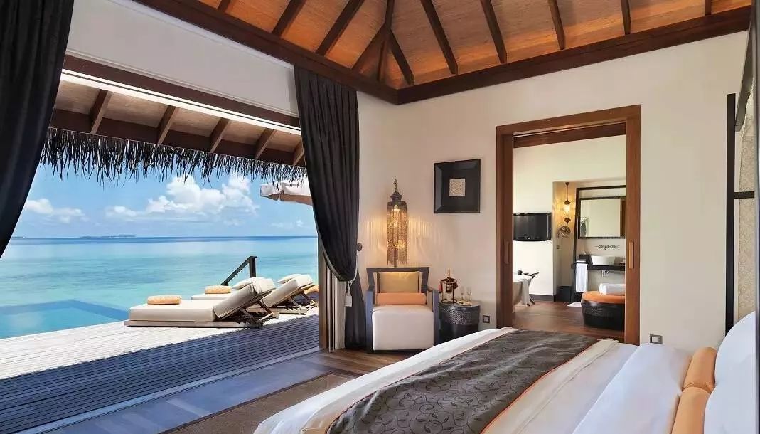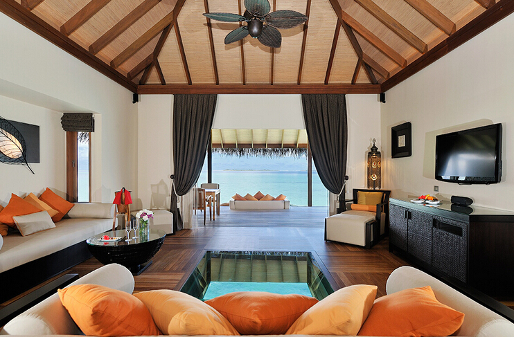 套房建于水上,设有一间卧室,玻璃地板起居室,额外浴室,备餐间,户外阳台,日光浴场连水上吊床,以及和直达泻湖的通道,印度洋的慑人美景尽览无遗。