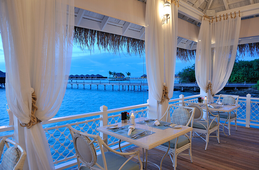 位于海景别墅之间的水上餐厅 ile de joie 供应优质美酒和寿司,各国顶级巧克力和各式顶级雪茄。餐厅分为露天或室内酒吧区,明澄如镜的泻湖环抱,缔造独一无二的餐饮体验。还会提供奢饰品和特色海鲜项目,例如鱼子酱,牡蛎和蛤等等。
