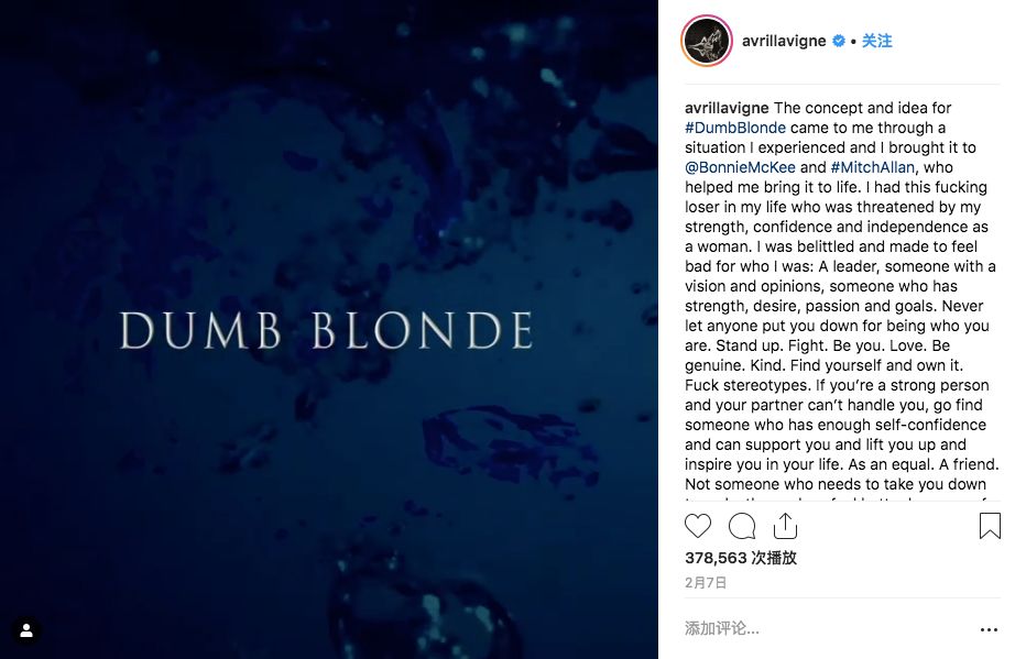 根据艾薇儿早前在Instagram上的一则贴文,其用意在于鼓励所有被低看之人不要在情感关系中迷失自我: