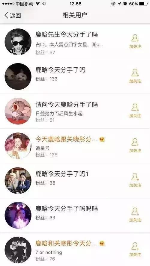 甚至在这段恋情被公布的第55分钟,微博上就出现了一长溜类似@鹿晗今天分手了吗 的账号,可以算是“迷妹之心,路人皆知”了。