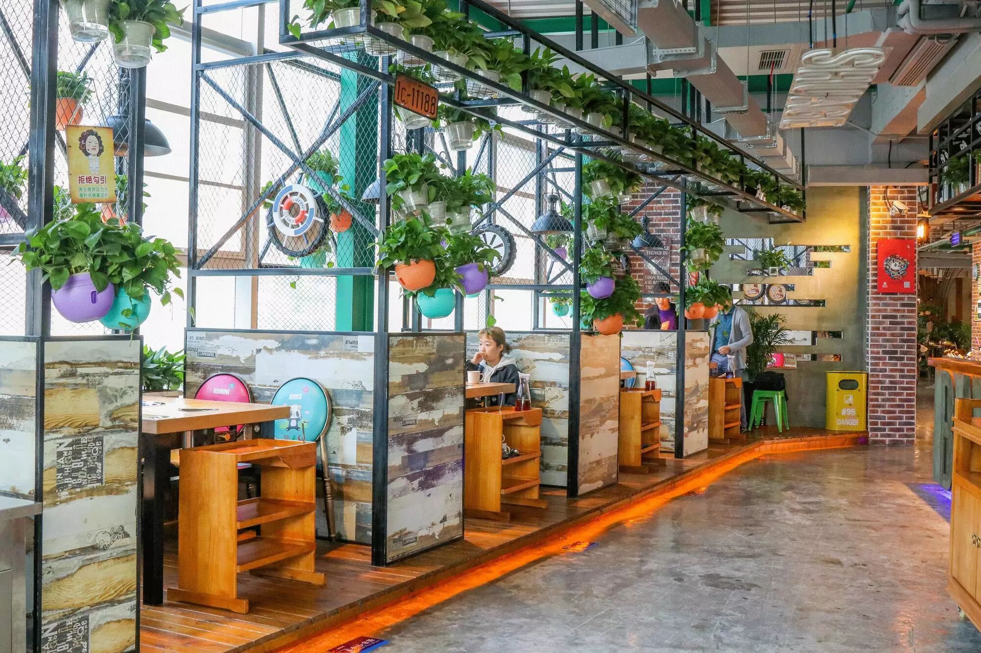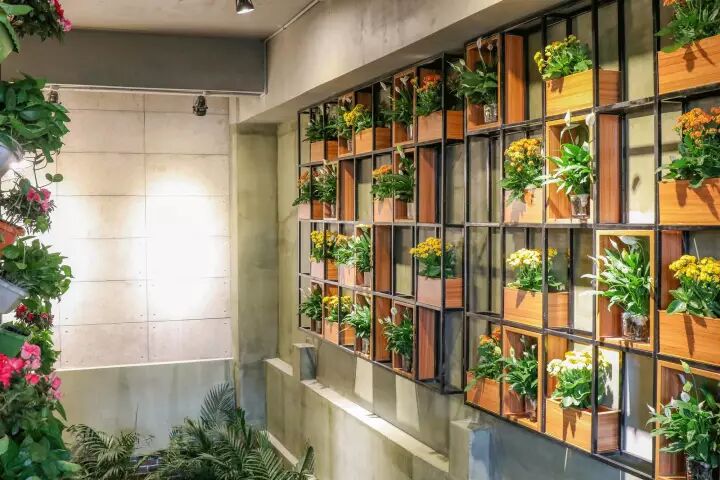 高级的灰墙、工业风的铁架、自然风的木盒、铺满一面墙的绿植,让人耳目新。