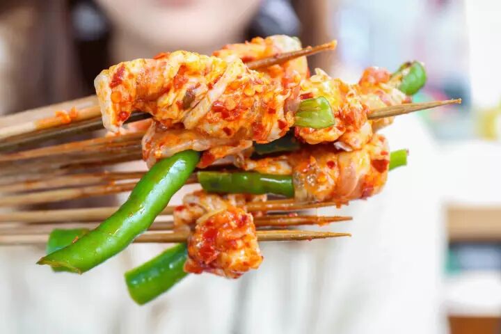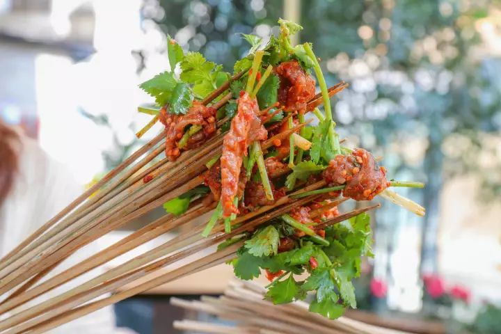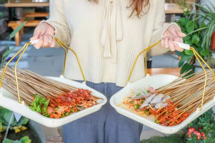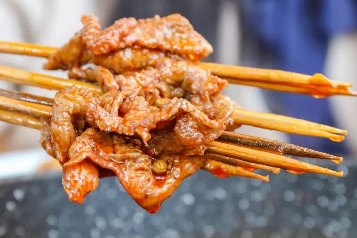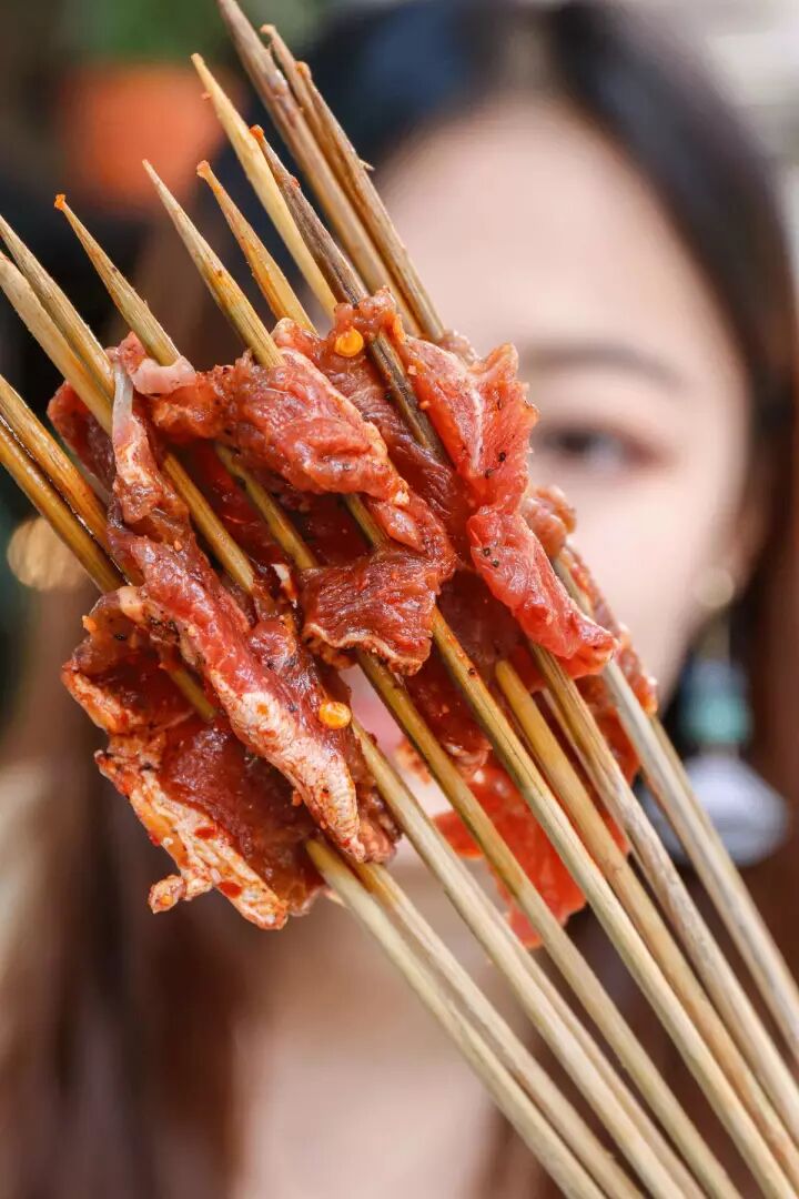 牛排居然用来串串?居然还能这么好吃?牛排被切成薄薄的一片,完美的雪花纹路彰显着它的好品质。