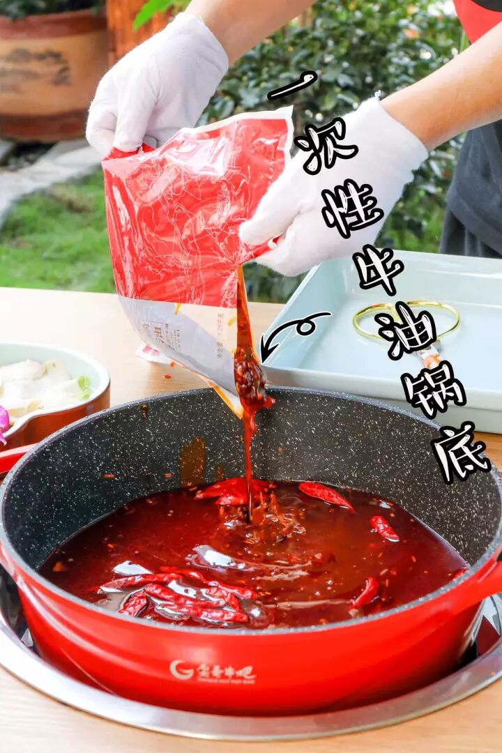 包含了金塔辣椒、印度鬼椒、茂汶花椒的纯牛油的底料包,开袋就能闻到香浓的牛油味,而且当着你面下底料包,绝对的保证了一次性底料的新鲜健康。