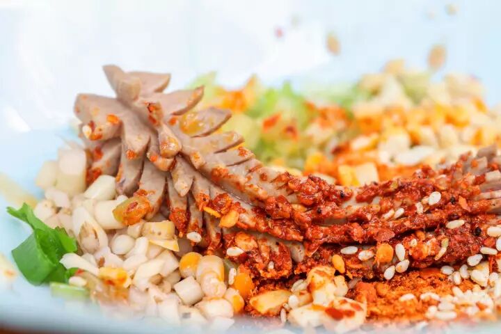 斜刀0.2cm,直刀1cm,腰花被精湛的刀工切花,下锅30秒,花开卷翘,蘸起海椒面,带着隐隐的红酒香味下肚,让人上瘾。