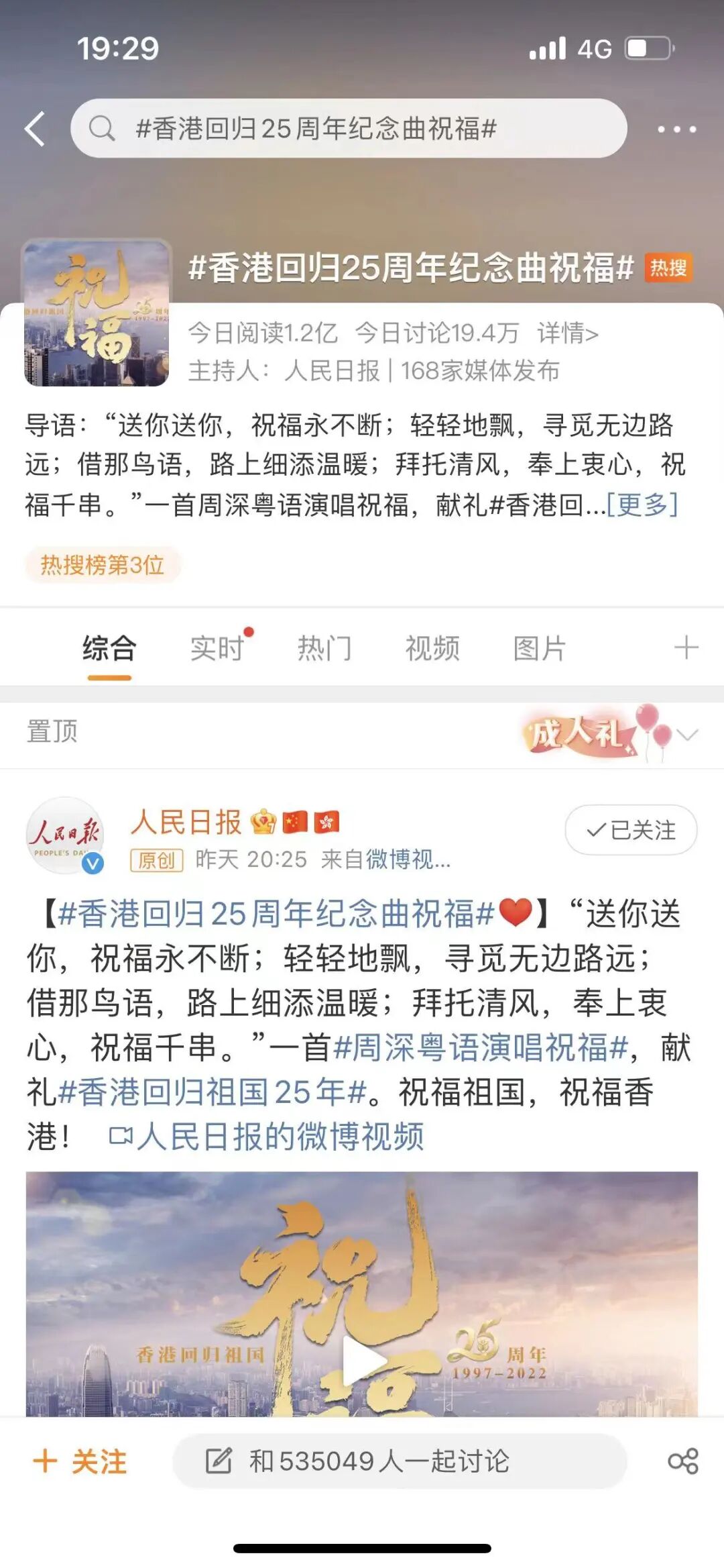 周深新歌登上热搜!4分钟,唱出亿万人心底深藏多年的情怀 青年之声 内地男星 2022-06-30 22:21:53 299 创作不易,用心坚持,欢迎请BaGua喝几杯爱心咖啡!打赏并支持本文 打赏并删除本文 文/青君图/来自网络1997年7月1日零时,全世界的目光聚焦香港,《义勇军进行曲》在香港会议展览中心内奏响,五星红旗与紫荆花区旗首次同时升起。心潮澎湃,热血沸腾,彼时彼刻的心情,被所有经历过这历史性一幕的人在记忆中铭刻。“东方之珠,熬过锻炼,熬过苦困遍历多少变迁;东方之珠,赢过赞羡,赢过一串暗淡艰苦的挑战。”回归夜演唱会上,刘德华和那英合唱起那首《东方之珠》,所有人跟着电视合唱,脸上有笑,眼中含泪。25年后,又一首经典粤语歌曲《祝福》作为庆祝香港回归25周年纪念曲,由中国移动咪咕、人民日报新媒体、周深工作室联合改编出品,被歌手周深再次唱响:“送你送你/祝福永不断/轻轻地飘/寻觅无边路远/借那鸟语/路上细添温暖/拜托清风/奉上衷心/祝福千串。”熟悉的词曲搭配周深清澈悠远的粤语演唱,伴着清风将这份美好的祝愿送到香江畔,如同歌里在山中流转的清泉,悠悠地沁入心里。歌声又仿佛一场跨越25年的隔空对话,告诉当时的香港:历经沧海桑田变幻,如今的东方之珠“风采浪漫依然”。《祝福》原唱为叶蒨文,作为她1988年的同名专辑主打歌曲一推出便风靡全港,横扫乐坛三大颁奖礼,获奖数刷新了谭咏麟此前创下的纪录,也让这首歌成为粤语流行歌曲中的经典,在30多年后的今天依旧余音袅袅,历久弥新。不久前在《声生不息》节目中,61岁的叶蒨文一身红裙,再次演绎了这首歌曲。当旋律响起,依旧温婉清澈的声音轻轻诉说着深情,歌词与旋律的意境绵远悠长,送上声声祝福不断。周深重新演绎的纪念曲《祝福》是致敬,更代表着在香港回归25周年的重要时刻,所有人对香港和祖国送上的深深祝福。作为90后歌手,周深也是在港乐的陪伴中长大的一代,十分熟悉和喜爱粤语歌。某音乐节目中他与香港歌手李克勤搭档的合作舞台,让《月半小夜曲》《爱情转移》《红日》等经典粤语歌自带画面感,贡献了很多出圈的“神仙舞台”。虽然已经有不错的粤语基础,但为了完整演绎出《祝福》这首经典歌曲的情感细节,周深专门请了来自香港的粤语老师一句一句指导自己的发音,录制过程中也一遍遍地与老师一起听回放、抠细节,力求用纯正的粤语和最饱满的情感投入演唱。6月29日20点,歌曲正式发布后很快就冲上了热搜。社交平台上,来自五湖四海的人因为同一首歌汇聚,分享着心中同一份温暖与感动:祝福祖国,祝福香港,我们的明天会更美好。音乐是时代最美好的载体之一,也是身处同一种中华文化中的我们彼此联结、互相认同的纽带。歌曲演绎故事、诉说情感,它的力量足以穿越时间,将所有人的心凝聚在一起。当创作于30年前的这首《祝福》再次在今天唱响,表达的是全体中国人民共同的心声。对过去25年的回望与感慨,对祖国未来的殷切企盼,全部化作悠悠流泉,送上“祝福”千串。正值香港回归25周年,最近各大视频、音乐和社交平台上,正在掀起一场关于港乐、港片、港剧的大型怀旧热潮。周星驰、成龙、任达华、周迅、汤唯等50多位香港与内地明星参加的庆祝回归云歌会,《一生何求》《偏偏喜欢你》《潇洒走一回》《风继续吹》……每一首港乐经典都是一记“回忆杀”,精准敲击在无数人的心上。作为新媒体国家队,中国移动咪咕在咪咕视频、咪咕音乐上分别推出了庆祝香港回归25周年的专题,那些经典的港片、港剧主题曲《上海滩》《笑看风云》《归去来》《岁月如歌》《女人本色》《岁月神偷》……光是看名字,就已经梦回曾经守在电视机前追过的《神雕侠侣》《天龙八部》《冲上云霄》,还有跟小伙伴们一起看过一遍又一遍的那些星爷的电影。建党百年晚会上,刘德华与那英重现25年前的经典舞台,再次唱起《东方之珠》时,很多人内心的激动更是无以言表。25年间香港与祖国的面貌都已发生巨变,但这一刻我们知道,大家同频跳动的那颗心始终未变。香港回归25载,全体国人共同的情感记忆浓度仍在不断加深,但它们不仅仅来源于港乐、港片的文化连接,更在这25年间同发展共繁荣,持续创造和累积着新的记忆,续写着同气连枝的血脉亲情。许多人都还记得,25年来那些与无数人息息相关的历史性瞬间:1999年,港澳同胞回乡证正式启用,2003年,香港开放内地游客自由行,无数香港与内地的亲人迎来久违的团圆;2000年,“中国香港”第一次参加奥运会,2021年东京奥运会上,男子击剑运动员张家朗夺得回归以来的首枚金牌;2003年,CEPA正式签署,为香港经济注入了强劲的发展动力;2015年,“粤港澳大湾区”概念首次被提出;2018年,全场55公里的港珠澳大桥正式通车,这是粤港澳三地首次合作共建超大型跨海交通工程;2018年,广深港高铁香港段通车,标志着香港正式接入了内地的高速铁路网,融合发展再次“加速度”。从推动香港离岸人民币业务到支持香港参与“一带一路”建设,从开通“沪港通”、“深港通”、“债券通”到推进粤港澳大湾区建设,坚持发展是香港的立身之本,祖国始终是香港发展的坚强后盾。而背靠祖国,面向世界,香港也从此拥有了抵御风浪的底气和前进的不竭动力。就像漂浮的岛终究找到了那块背靠的大陆,将根系深深地扎进那片沃土中,历经阳
