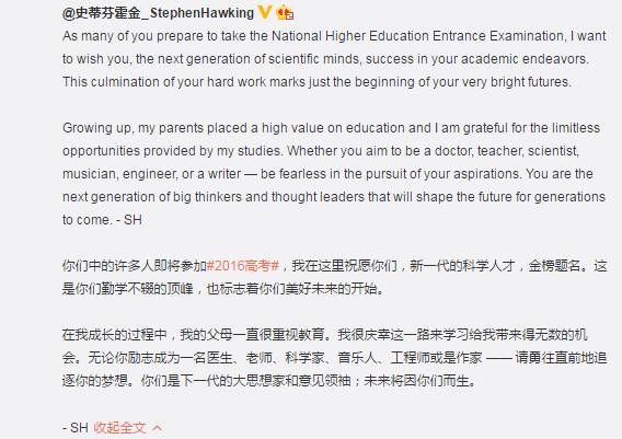 6月6日,著名物理学家霍金更新微博,发文鼓励高考生。网友表示:“真·学霸·锦鲤”、“觉得自己充满力量”、“学到了高考的最正宗的表达方法”。随后,姚晨转发评论道:“大神护佑,逢考必过!”