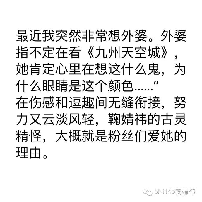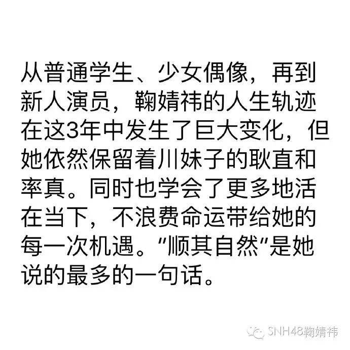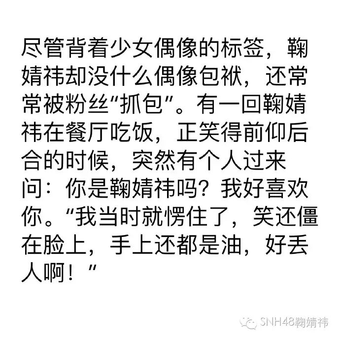 尽管背着少女偶像的标签,鞠婧祎却没什么偶像包袱,还常常被粉丝“抓包”。有一回鞠婧祎在餐厅吃饭,正笑得前仰后合的时候,突然有个人过来问:你是鞠婧祎吗?我好喜欢你。“我当时就愣住了,笑还僵在脸上,手上还都是油,好丢人啊!”然而丢完人,继续大大咧咧,累了就往地上一坐,一言不合就“哈哈哈哈哈哈”合不拢嘴,难得闲下来,就抱个麻辣烫坐在宿舍的餐厅里追《芈月传》。她形容自己“活得很粗糙”,有天大的问题,一顿火锅就能开心回来。