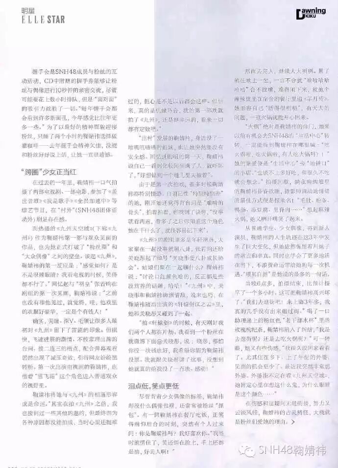 在过去的一年里,鞠婧祎一口气拍摄了两部电视剧、一部电影,参加了《盖世音雄》《我是歌手》《全员加速中》等综艺节目,在“村外”(SNH48团体活动外)刷足存在感。而热播的《九州天空城》(下称《九州》)作为鞠婧祎第一部与观众见面的作品,也为她正式打破了“粉丝圈”和“大众偶像”之间的壁垒。谈起《九州》,鞠婧祎的第一反应是:“感觉如何?是不是很辣眼睛?我看电视的时候,笑得都不行了。”回忆起与“羽皇”张若昀在剧组的第一次见面,鞠婧祎说:“之前也没有和他见过,就觉得,哇,他戏里的衣服好豪华,一定是个有钱人!”