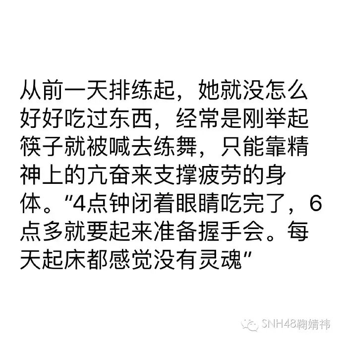 美少女梦开始的地方是在上海嘉兴路哈尔滨路路口的星梦剧场,附近的罗森便利店,偶尔还能看到她们跑出来买东西的身影。SNH48的成员们大多数没有演艺经历,只是怀揣明星梦的普通女孩,甄选入团后,经过几个月时间的训练便登台亮相。每周不间断的演出给了她们足够的表现和学习的机会,从不会化妆到变身女神,从怯懦怕生到气场惊人,可以说,她们成长路上的每一步都暴露在粉丝的目光之下。在通往偶像加冕的道路上,她走了3年。从第四,第二,到第一,鞠婧祎说,比起突如其来的加冕,她更享受这种脚踏实地的感觉。上台前,她回想起自己刚入团时的样子——青涩、不敢讲话,有一点害羞。而此刻,无数粉丝正在台下齐喊她的名字。她感到自己确实在粉丝的支持下成长了,变得不一样了。“其实报出第二名的时候,我已经知道自己的名次了。上台时我一心只想着披风要披好,因为去年得奖时我的披风一直往下掉,我只好一手捧着很重的奖杯,一手拽着披风。”她一再强调,这是她“最最最真实的感受”。所幸,今年的披风、王冠全都戴得很完美,让这位22岁的姑娘松了一口气,在舞台上留下最青春无敌的痕迹。拿着第一名的奖杯回到房间时已是深夜3点,鞠婧祎和队友一起叫了外卖——包子和口水鸡。从前一天排练起,她就没怎么好好吃过东西,经常是刚举起筷子就被喊去练舞,只能靠精神上的亢奋来支撑疲劳的身体。“4点钟闭着眼睛吃完了,6点多就要起来准备握手会。每天起床都感觉没有灵魂”握手会是SNH48成员与粉丝的互动活动,CD中附赠的握手券能够让粉丝与偶像进行10秒钟的亲密交流,尽管可能要花上数小时排队,但是“面对面”的吸引力战胜了一切。“每年握手会都会看到许多新面孔,今年感觉比往年更多一些。”为了以最好的精神面貌迎接粉丝,只睡了两个小时的鞠婧祎选择猛灌咖啡——去年握手会精神欠佳,没能和粉丝好好说上话,让她一直很遗憾。