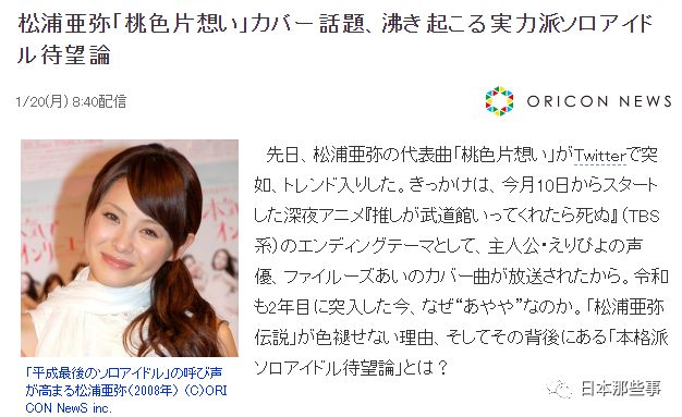 而最近拥有高话题度的新番《神推偶像登上武道馆我就死而无憾》的片尾ED,也使用了松浦亚弥的老歌《粉色暗恋》。