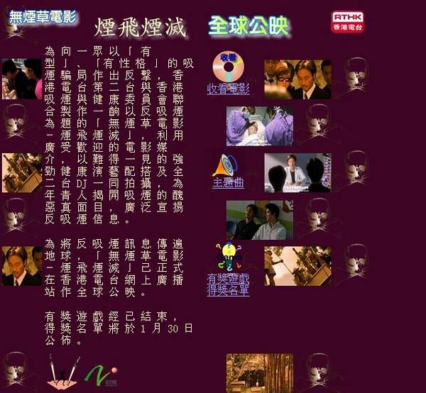 影片在正式开映之前,播放了一段电台主持人在放映室里对张国荣的采访,张国荣讲述了拍这片子的来龙去脉,一再感谢不收分文参与制作的演员与工作人员,说充分体现了演艺界人士的无私精神和对社会的贡献,并希望他日拍长片时,可以请这些好演员和好朋友,一起再拍些好电影给大家欣赏:“……这个《烟飞烟灭》,大家可能会抱很大期望,但若不符合你心中所想,请多多包涵。不过,是为香港政府、香港电台和香港人去做一件很有意义的工作,我觉得很高兴。希望每一个镜头都能让你们喜欢,故事令你们感动。最重要的一个信息:戏可以重新再演,但是人只能活一次。所以最终目的是告诉大家:不要吸烟,或减少吸烟,因为吸烟真的会影响你们的健康。”