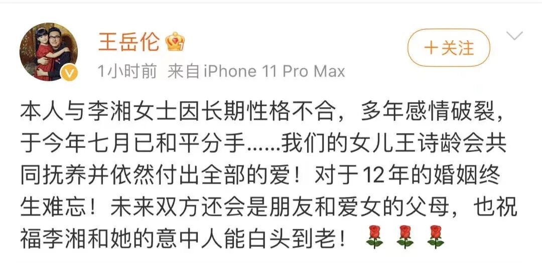 李湘王岳伦官宣离婚!恭喜!! 花田大叔 内地女星 2021-12-01 11:00:50 1091 创作不易,用心坚持,欢迎请BaGua喝几杯爱心咖啡!打赏并支持本文 打赏并删除本文 点击上方名片关注花田大叔来源 / 遇见番茄(ID:yujianfanqie)01王岳伦又又又又又被拍到和异性亲密搂抱了!11月20日深夜,王岳伦与几位好友前往KTV相聚,直到凌晨3点左右,王岳伦才被一位美女颤颤巍巍的扶着走出KTV。在和友人们分别的时候,王岳伦很自然的把女子搂进了怀里,然后满脸笑容的和朋友们寒暄着。而女子也顺势挽起了王岳伦的胳膊,宛如一对热恋中的情侣。寒暄结束,王岳伦拉着女子一同上车返回了酒店。到了目的地后,王岳伦再次主动搂起了女子的肩膀然后一同进了酒店。一直到第二天下午,两人才从酒店出来。这一夜发生了什么没人不知道,但可以肯定的是,王岳伦心情挺美的,全程一直都是乐呵呵的,丝毫不避讳和女子之间的亲密接触。甚至就在和该女子分别的时候,两个人还不忘来一个热情的拥抱。在看视频的时候,我的表情就像这个表情包一样,充满了大大的问号。好家伙,什么时候偷情都可以这么高调了?看他这前呼后拥的架势,知道的是在聚会,不知道的还以为他要选妃呢。不过,对于王岳伦的这种花边新闻,网友们已经是见怪不怪了,毕竟这也不是他第一次被爆丑闻了。王岳伦最早被爆出丑闻是在2018年,他在北京被拍到与一位穿黄裙子的美女共进某酒店,两人一直在酒店呆了3个多小时才回到车上。当时这件事引起了不小的风波,不少网友怒斥王岳伦是渣男,后来还是李湘出面宣示主权,才算平息了这场风波。但王岳伦太不争气了,没过两年他又在KTV被拍到与异性朋友又是搂腰又是壁咚的画面。哎,真是那啥改不了吃屎。不过这一次的王岳伦可没有冷处理,而是义正严辞的发出了一份声明,内容总结下来一句话:我是无辜的,有人在算计我。并且再三表示自己一定要戒酒,不让再让喝酒误事了。结果一年的时间过去了,王岳伦不仅没有能戒掉酒,反而是再度打了自己的脸。视频被曝光后,有网友调侃道:看吧,王岳伦一会又要跳出来说自己是被人陷害的,然后李湘再上演一场救夫的戏码这事就算过了。但奇怪的是,截止到目前为止王岳伦没有任何的回应,就连一向力挺老公的李湘,这次也没有任何的表态。对此有不少网友表示二人可能已经离婚了。果不其然,就在昨天凌晨的时候,王岳伦发微博宣布了两人已经于7月离婚了。(不得不说一句,这个声明真的好绿茶)令人不解的是,这条微博没过多久就被王岳伦删除了,而李湘那边依旧是毫无回应。看来,两人是真的离婚了。不过这也没什么好奇怪的,因为他们之间的关系,早在王岳伦第一次出轨的时候,就已经产生了微妙的变化。02王岳伦第一次被拍到出轨的时候,最先做出回应的人是李湘(李湘8号,随后王岳伦9号才正式回应)。她在微博上晒出了一张和他人的聊天记录图然后强硬的表示道:朋友的女朋友也不可以坐我的车。此回应一出,就劝退了不少的吃瓜群众,因此也没让这件事的负面影响闹的有多大。那个时候的李湘,虽然嘴上力挺老公,但对于她这样一个实打实摸爬滚打上来的人来说,哪有那么容易的相信这种鬼话?她只是埋在心里不说罢了。第二次王岳伦再次被爆出轨后,李湘就没那么积极了。王岳伦当时一共发布了3条动态。第一个动态是他正面回应此事的,但李湘没有做任何的回应;第二个是他高调表白李湘的,尴尬的是李湘没有立刻就回复,直到后面才回复了3颗心;第三个是事情过了半个月后他又发出声明说自己是被陷害的。虽然还是跟上次一样选择声称信任王岳伦,不过李湘的行动可就没那么诚实了。因为在经过第二次事件没过多久,就有网友发现王岳伦已经从一家李湘关联公司退股了,55%的股份全都退了,不再担任任何职位。而且他还退出了公司的最终受益人行列,这也就意味着王岳伦以后和李湘这家公司没关系了。这点就有点矛盾了。因为当时的李湘和王岳伦正在《幸福三重奏》上大秀恩爱,可私底下却突然退股,想来想去只有一个可能:节目上恩爱,是因为需要捞金;私底下准备各走各路才是二人之间最真实的现状。而二人关系发生最明显变化的,就是在今年。11月20日,王岳伦被爆出出轨后,就有网友发出质疑:如果两人不是离婚了,他哪里敢这么高调呢?翻翻他们的微博你会发现,两人之间的互动,除了今年为女儿王诗龄庆生外,已经很久没有同框互动了。而王岳伦之前的那条表白李湘的动态,也早已经删除了。甚至是当初二人录制综艺节目各种甜蜜瞬间的记录,也已经消失不见了。(这条微博已经找不到了)李湘也一样,早就找不到和王岳伦有任何相关的动态。再加之这次绯闻的沉默,所以两人很大概率是已经离婚了。说实话,如果李湘真的离婚了,我一点都不惊讶。因为李湘从来都不是那种传统意义上喜欢奉献自己来成全别人的女人。她杀伐果断,有着狼一般的狠劲。03李湘是凭借着《快乐大本营》出道的,走红那一年,她只有23岁,别看她年纪轻轻的,头脑却很不简单。在同龄人都想着稳定的时候,她就偏偏要折腾。唱歌、拍戏、投资、转型幕后当老板……一样不落。涉及的领域很复杂,但李湘的干劲十足。直到2006年,她终于创办了快乐星文化有限公司,两年后,她又奋起直追投资成立了芒果影业公司,这也让她赚到盆满钵满。李湘的每一步,都走的干脆利落