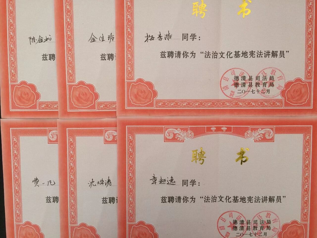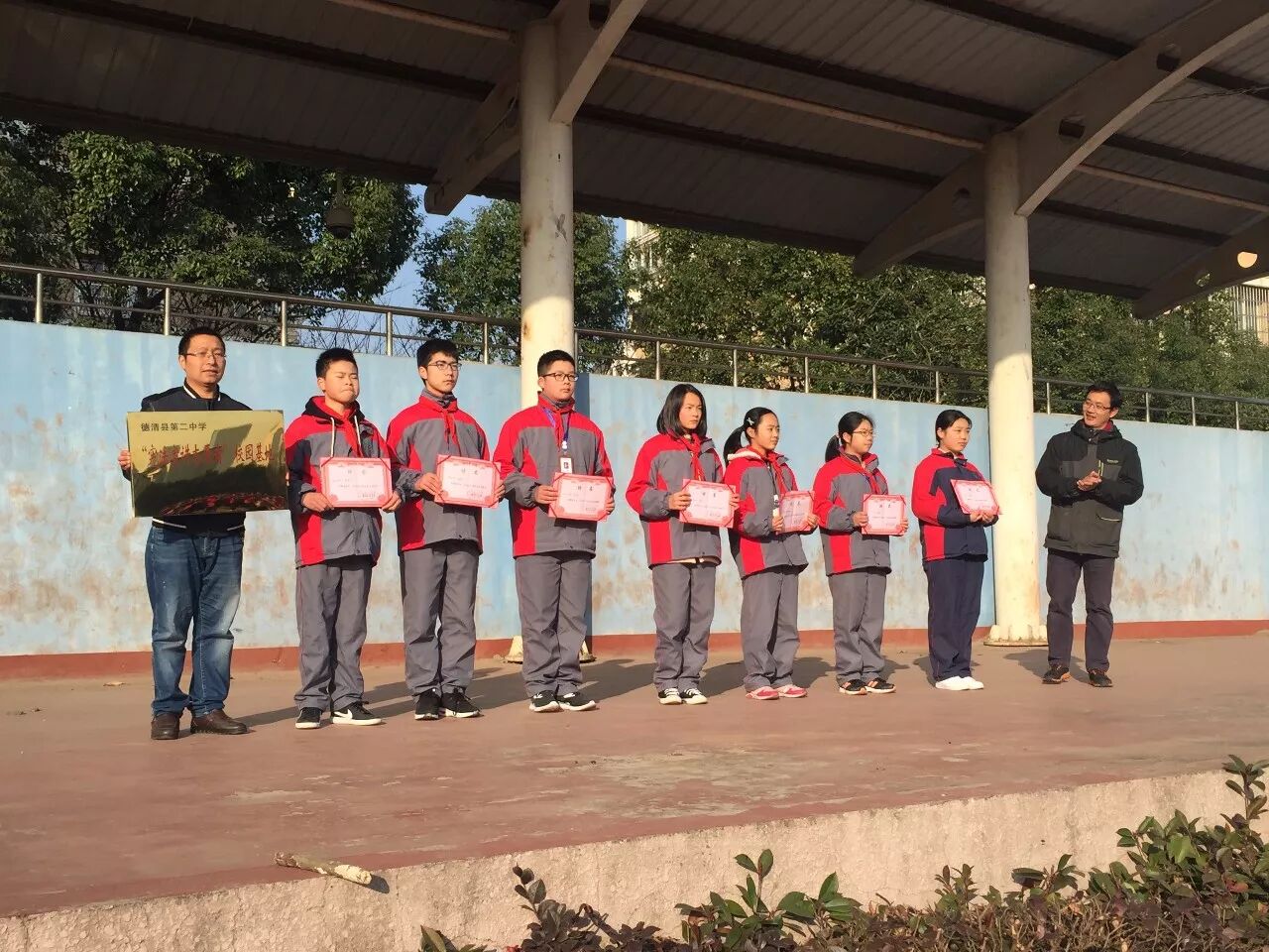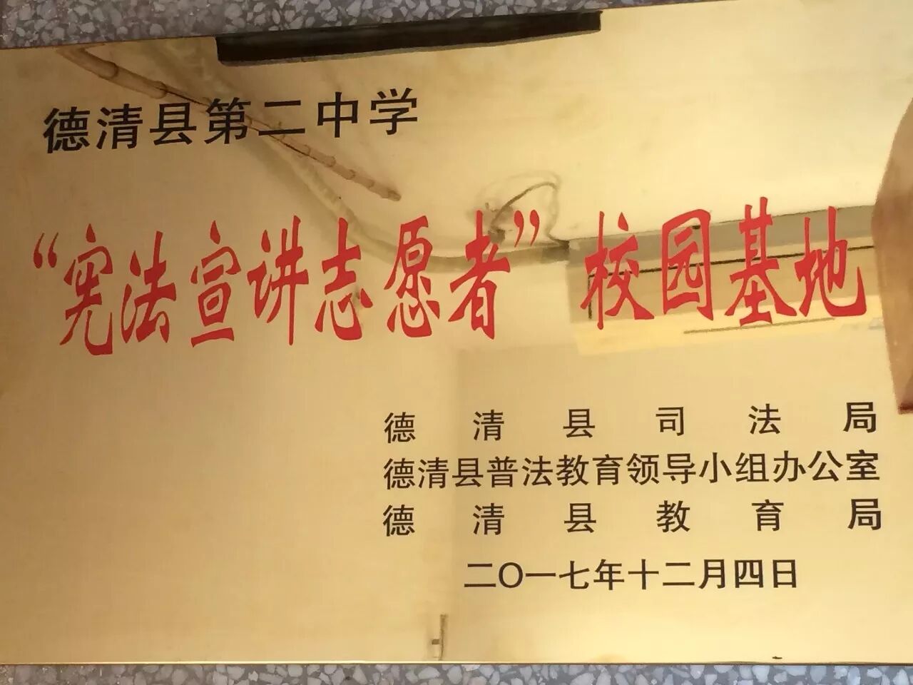 基于学校所付出的努力,德清县司法局、德清县普法办、德清县教育局联合授予我校“宪法宣讲志愿者校园基地”的称号,同时我校学生庄园等七位同学也被授予我县首批“法治文化基地宪法讲解员”称号。德清县普法办吴鑫松科长,为我校授牌,为七位“讲解员”颁发聘书。另外,县阳光里程社会服务中心刘建伟主任为学校赠送了40册《第一本法律漫画书》。