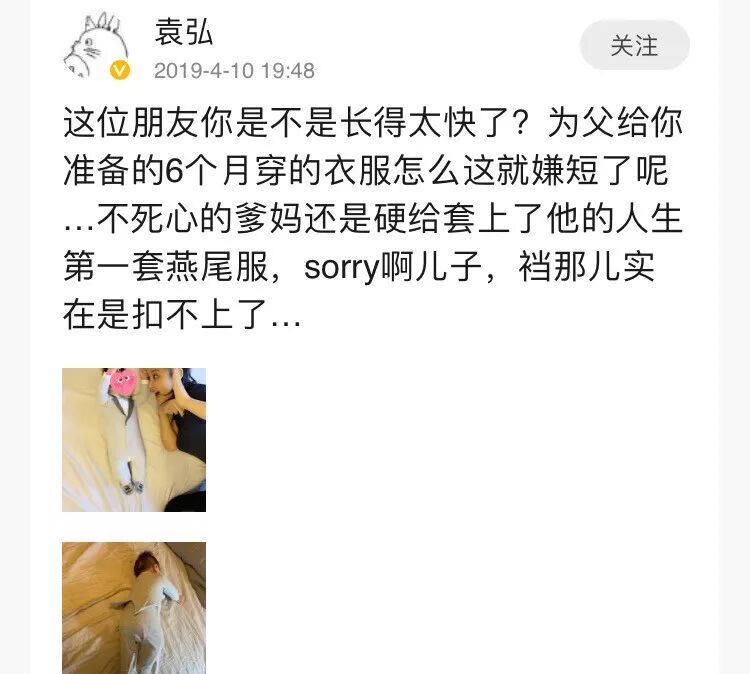 今年2月袁弘和张歆艺喜得一子。昨天,袁弘发博有爱吐槽“儿子长得太快,准备6个月大穿得衣服已经太小了。”现在他的微博除了围绕晒老婆,还有晒娃。