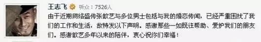 在一份恋情小心翼翼隐藏了7年,却在分手之后被单方面公开。2012年3月2日,王志飞发布一则微博声明,公开张歆艺和他结束了长达7年的“秘恋”:“由于近期网络盛传张歆艺与多位男士包括与我的婚恋传闻,已经严重困扰了我们的工作和生活,故特发以下声明:我与张歆艺已于近日正式结束恋人关系……”