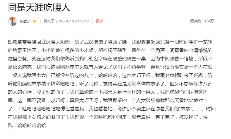 张歆艺在微博分享了这次奇遇,并配上“同是天涯吃腰人”的标题自侃。