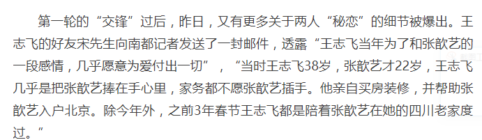不少人认为王志飞是以此事炒作。前日,王志飞亮相活动并解释“我压根没有经纪团队”。又有王志飞的好友爆料,说王志飞把张歆艺捧在手里,男方帮女方解决户口,连家务都不舍得张歆艺插手。