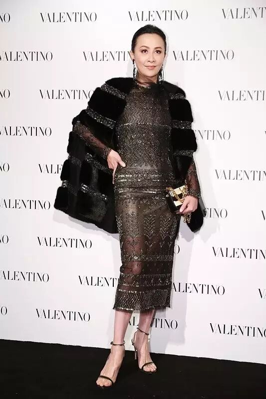 ▲刘嘉玲身穿黑色皮草背心,内搭Valentino 2015秋冬薄纱刺绣礼服,手持黑白条纹金色链条配饰晚礼包,脚踩金色一字带环踝高跟鞋。