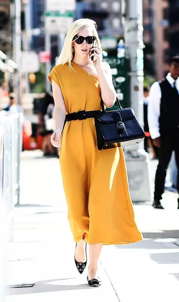 具有良好垂坠感的丝质连衣裙和略显硬朗的黄色宽腰带搭配出恰到好处的束缚感。