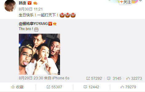 杨佑宁生日当天,他微博发布了一张和韩庚等人的搞怪合影,随后韩庚也转发,并配文:一起打天下!看来这就是《真三国无双》的桃园三兄弟啦!不过这么搞怪真的很难想象乃们英勇打天下的场面哇!