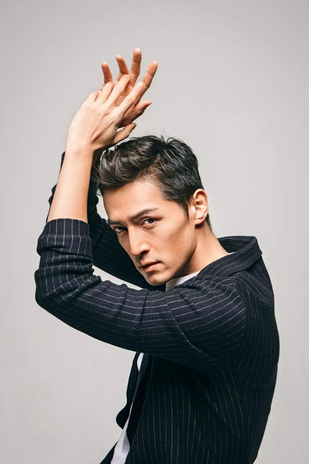 胡歌先生是极好的拍摄对象,不仅因为他久经镜头的考验,懂得摆出最合适的pose。还因为他能快速制造情境,提升画面的质感,当摄影师拿出准备好的三角框道具,胡歌立刻设计出被束缚同时挣扎求生的一系列神情和动作——那一刻他似乎在演戏,而不只是拍照。