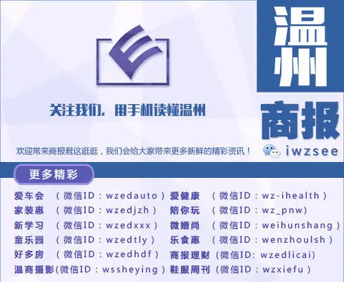 欢迎您订阅和关注《温州商报》官方微信,感谢您的支持和厚爱!每天我们会为您呈上一份新闻大餐!您也可以通过如下方式提供报料:微博 @温州商报.客服QQ 1139476040 、热线QQ 130038110、热线电话 0577-888171...