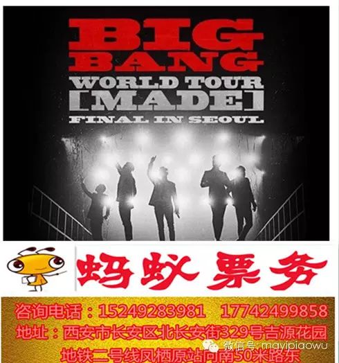 蚂蚁君经过多方联系和努力不负使命,最终确定下来西安站bigbang演出门票我们可以给大家提前预定了,福利第一时间分享给大家,bigbang中国巡演正所谓一票难求,上海 南京等站开票门票直接秒杀,演出现场门票售价高达万元,并且是假票满天飞,歌迷朋友们深恶痛绝,蚂蚁票务努力争取,西安站第一次投放两百张门票,看台,内场各100张,在这个提前给大家透漏一下,西安站门票总计为两万张,内场票占约百分之七十,此次门票通过网络渠道售票仅为2000张,剩余门票全部为线下渠道或者主办线下分销,不参与直接销售,此次蚂蚁票务西安站预订仅接受西安本地客户预订,确保下单客户都可以拿到门票,为坚决杜绝和制止假票现象,和切实保护顾客利益,开票后我们将第一时间和客户联系,携带本人身份证上门取票,届时补差价即可