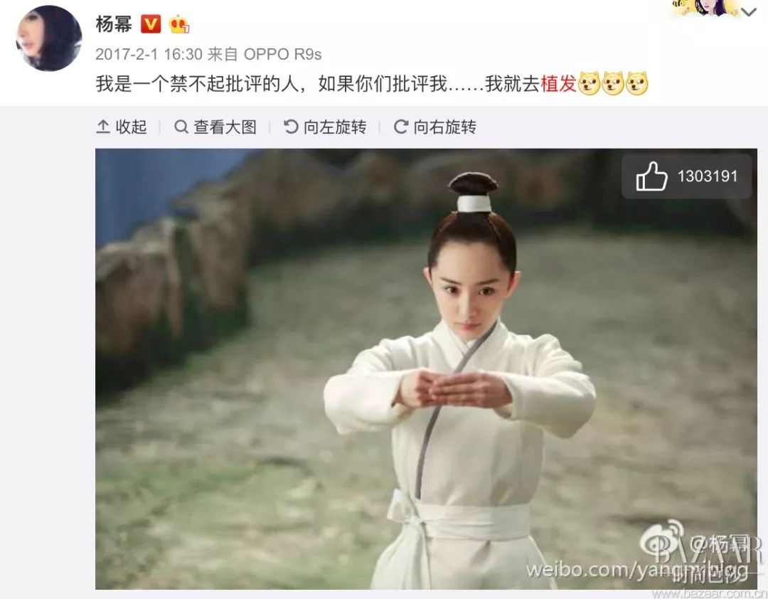 大幂幂甚至还自己发微博调侃:“我是一个禁不起批评的人,如果你们批评我……我就去植发”