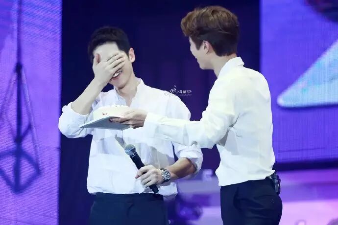 宝剑弟弟开粉丝见面会的时候,欧巴也是录制了VCR应援。朴宝剑欧巴可是我们的情敌二号啊,他公开说:“哥,我爱你!”上次宋仲基首尔粉丝见面会他作为神秘嘉宾出席,这次北京见面会他又是送蛋糕又是钢琴伴奏。
