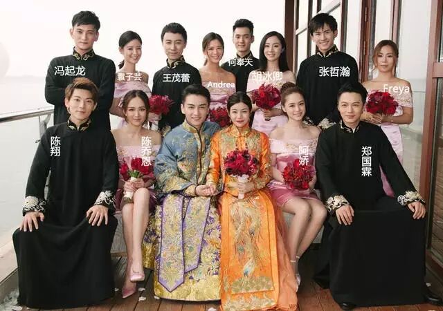 再来看看这张传遍大家朋友圈的大合影,我只是想说,为毛赶脚……跟伴娘们比起来,新娘陈妍希是最不漂亮的那个呢……利索的中式盘发和无辜的下垂言,再加上这个角度看陈妍希两口子坐的都不是很正,有点前倾的样子,所以导致她有辣么一丢丢像个老太太……