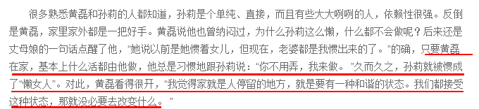 黄磊和孙莉不像一般的明星夫妻,他们的生活带了些文艺气息,他们住在离北京市区很远的郊外,平时的家务活是黄磊一手包办,他还说:“孙莉的懒是我惯出来的,平时只要我在家,都习惯了自己来亲手做。”