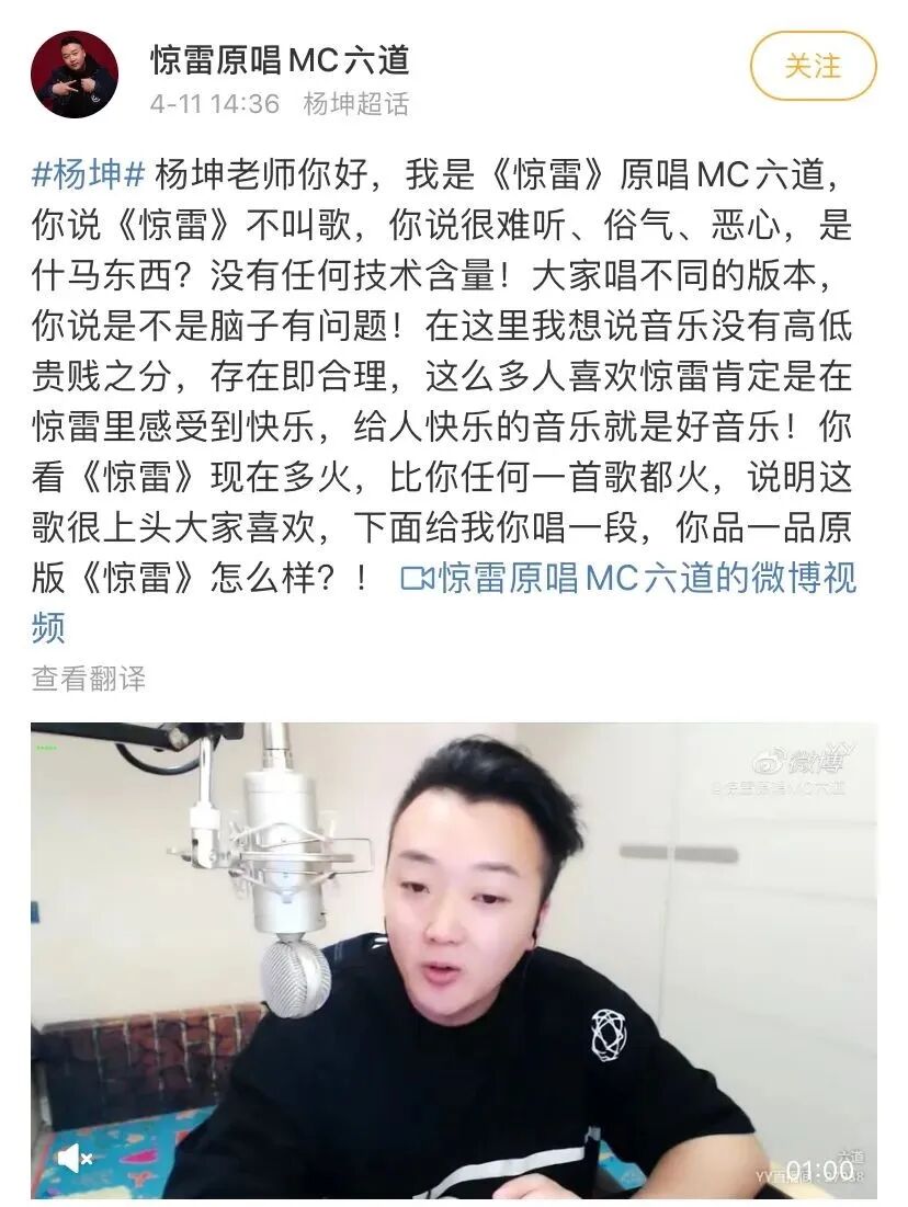被杨坤毫不留情地diss了一顿之后,《惊雷》的原唱MC六道很快便怼了回去: