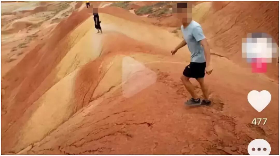 几位游客,为了炫耀求赞,违规进入甘肃七彩丹霞景区未开放区域,肆意践踏原始地貌,并嚣张宣称:“我破坏了六千年的(地)。”