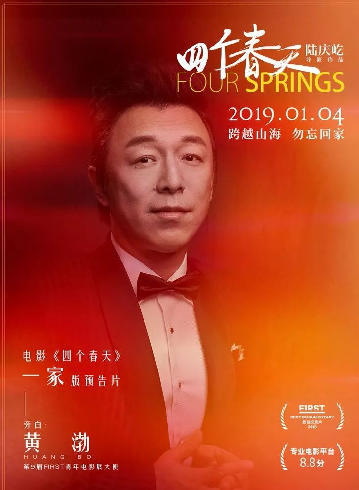 12月4日,由素人导演陆庆屹执导的电影《四个春天》曝光“一家”版预告片与海报。作为2018年FIRST青年电影展最佳纪录片,影片再次获得专业影人支持:继赵薇后,同为FIRST青年影展大使的黄渤也真诚助力,为预告片“一家”献声,伴随一段90年代家庭录像,用旁白娓娓道来质朴家庭的亲情时光。凭借对自己真实家庭生活的深情记录,陆庆屹导演的《四个春天》被观众誉为国产纪录片的“清流”,该影片在专业平台的评分高达8.8分,并已正式进入贺岁档,1月4日全国公映。