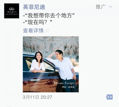 其次,此次也并非二人首次联手英菲尼迪,早在去年12月底,周迅高圣远夫妇婚后首次同台亮相就献给了英菲尼迪——担任品牌公益活动的宣传大使,共同号召全社会一起关注、关爱自闭症群体。而早在2014年1月,英菲尼迪中国便提出“敢•爱”的品牌传播概念,随后邀请周迅成为英菲尼迪首位“敢•爱”大使。双方的后续动作如何开展,一直牵动着不少目光。